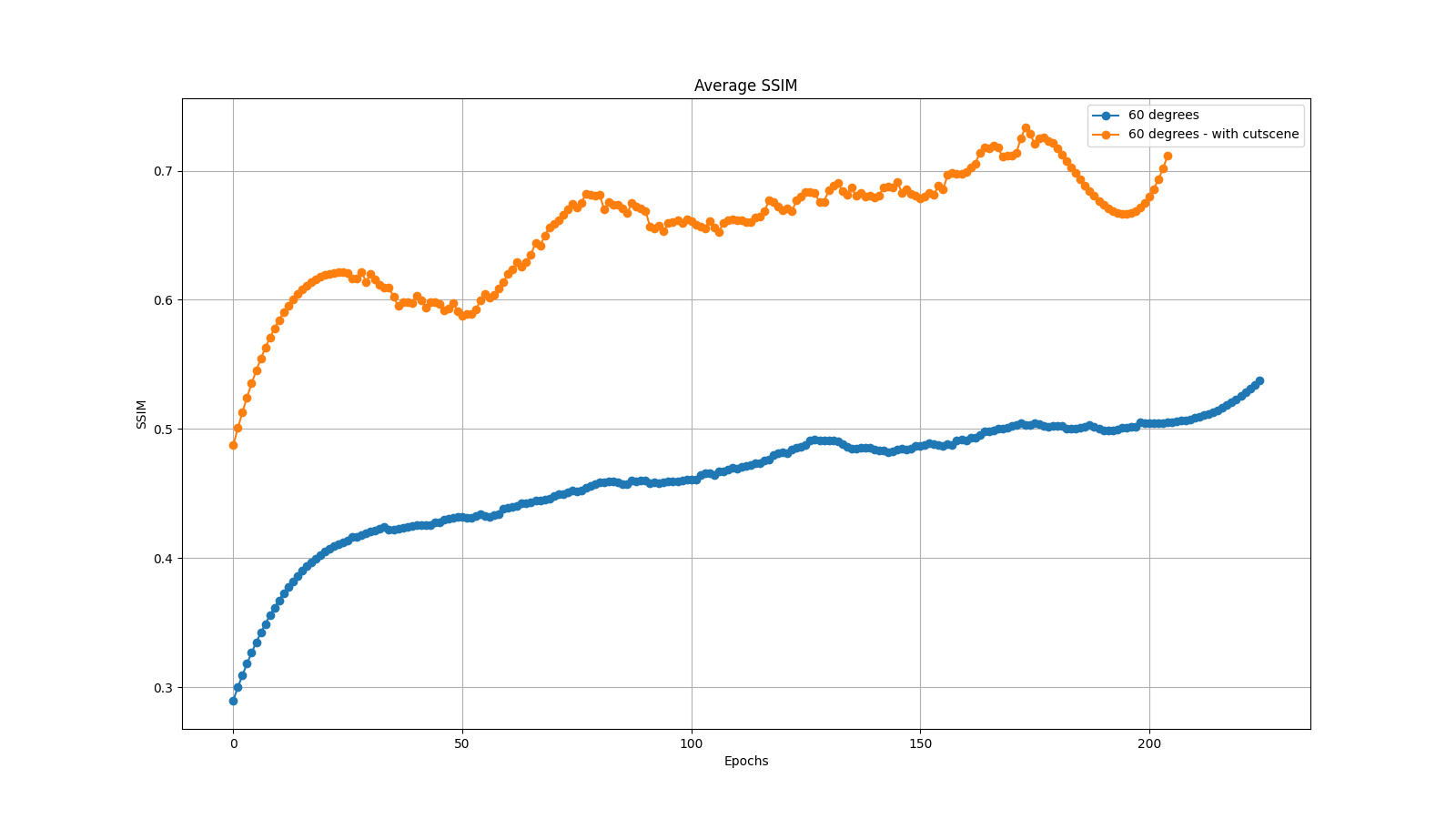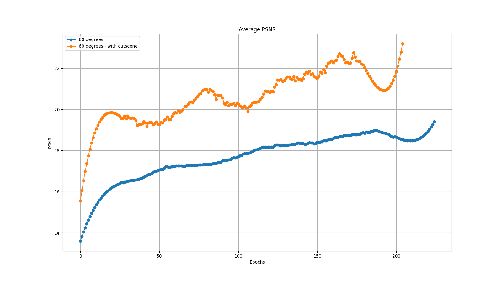 We again measure PSNR and SSIM as measures of reconstruction quality during training with cutscene augmentation.