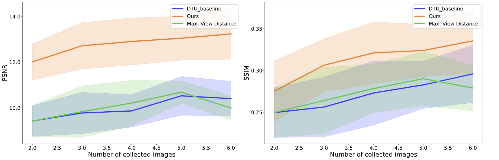 To test out planning performance, we took the trained model and tested planning. We start with a random set of two views, sample from all available ground truth views and choose the next best view based on three different policies. We report our model as "ours", the DTU pretrained model as "DTU_baseline", and the max view distance. We iterate until 6 views are collected and we measure the improvement of reconstruction with each new view collected using PSNR and SSIM as before.
