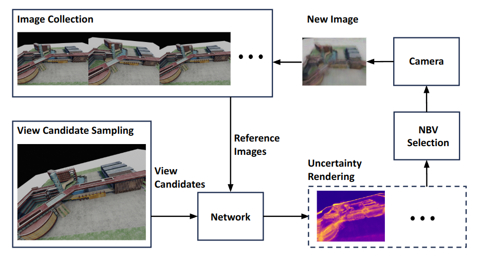the novel view with the highest average pixel uncertainity. The novel view is then